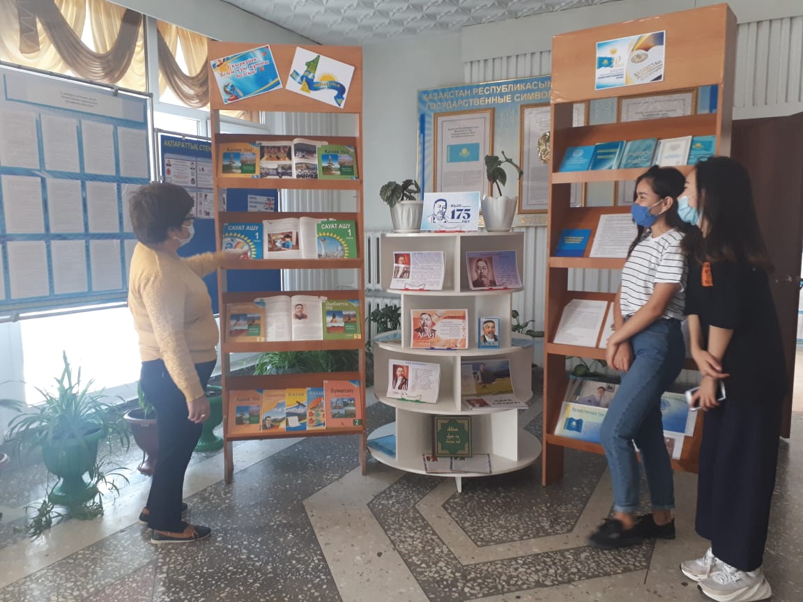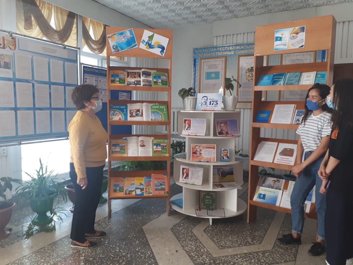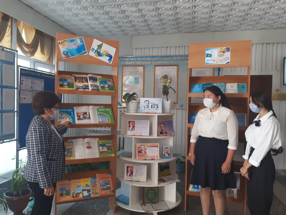 Көрмеге Абай Құнанбаевтың 175 жылдығы, 30 тамыз конституция күні және Білім күніне орай материалдар жинақталып, қойылды.