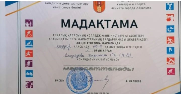 Арқалық қаласының колледж және институт студенттері арасындағы лига жарыстарының бағдарламасы шеңберінде жеңіл атлетика жарысында 100м, 400м, 800м, 1500м қашықтықта орын алған білім алушылары