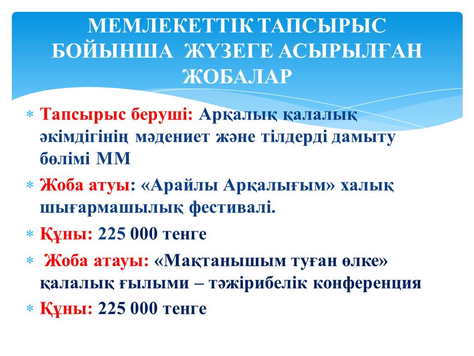 7 слайд (текст)Соның арқасында ҚБ биыл маусым айында мемлекеттік тапсырыс бойынша Арқалық қалалық әкімдігінің мәдениет және тілдерді дамыту бөлімі ММ-нің жариялаған жалпы соммасы 450 мың тұратын , екі жобасын ұтып алып, жүзеге асырдық.