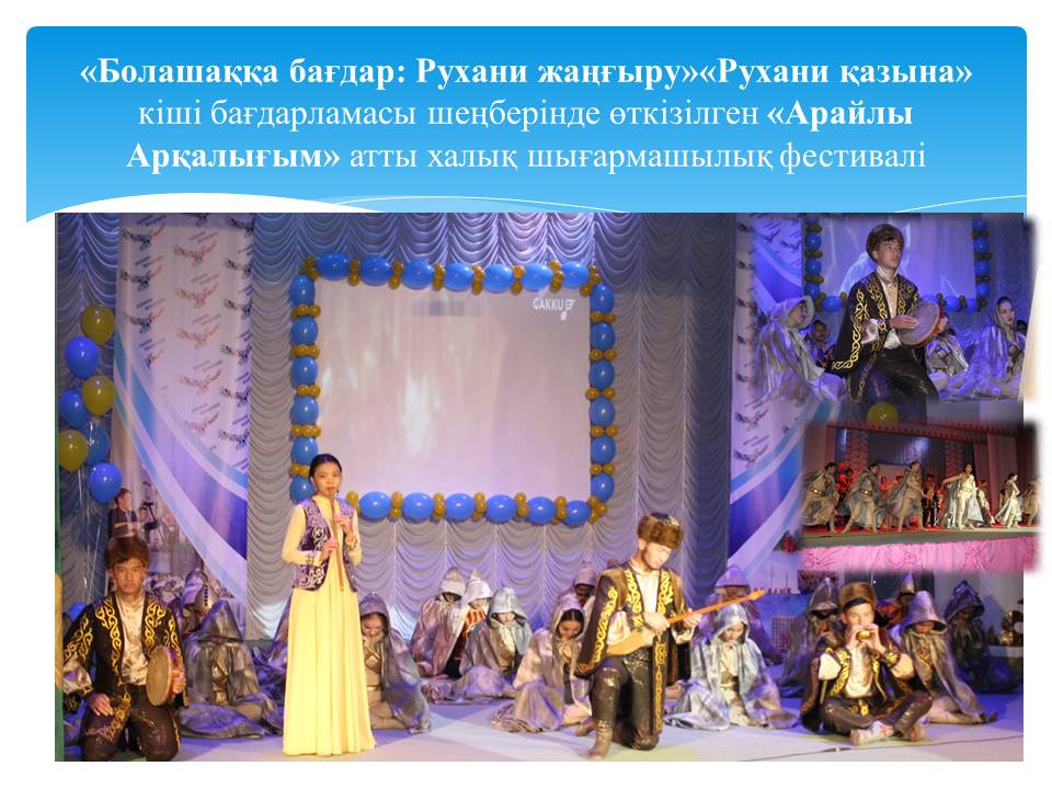 8 слайд Мұндағы, «Болашаққа бағдар: Рухани жаңғыру»«Рухани қазына» кіші бағдарламасы шеңберінде өткізілген «Арайлы Арқалығым» атты халық шығармашылық фестивалінің басты мақсаты: