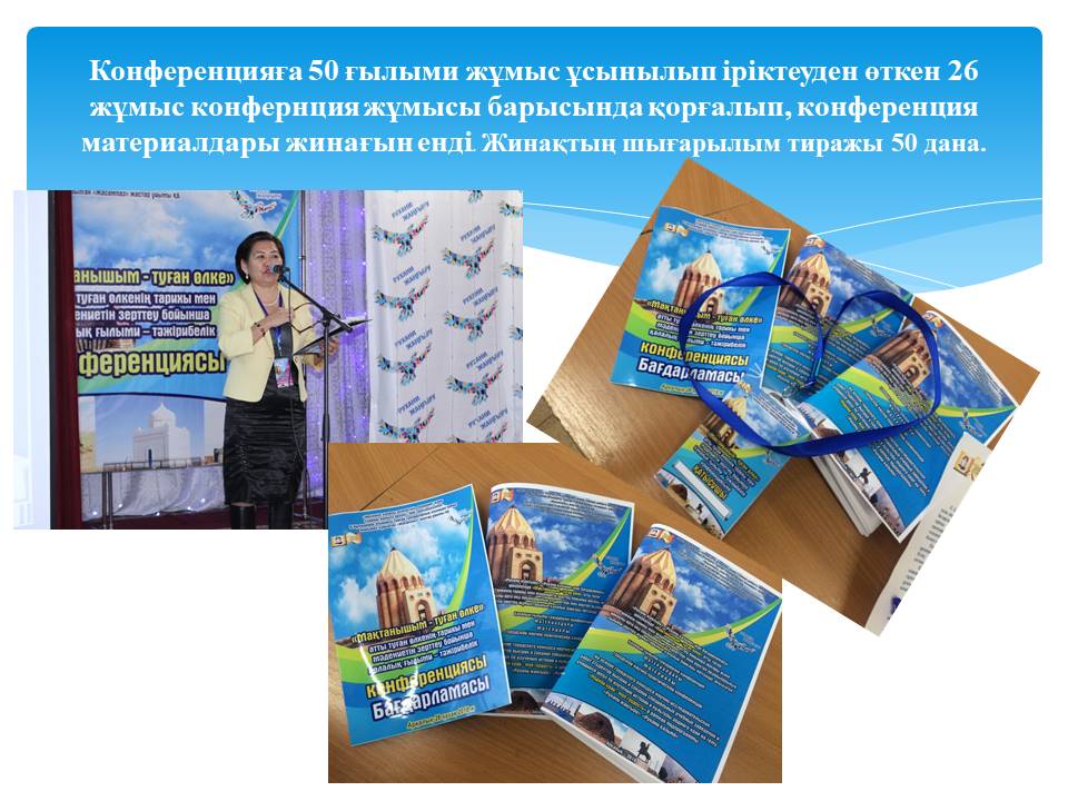13 слайд Мақсатты индикаторларға қол жеткізілді. Конференцияға 50 ғылыми жұмыс ұсынылып іріктеуден өткен 26 жұмыс конфернция жұмысы барысында қорғалды және конференция материалдары жинағына үздік деп танылған осы 26 жұмыс енді. Жинақтың шығарылым тиражы 50 дана.