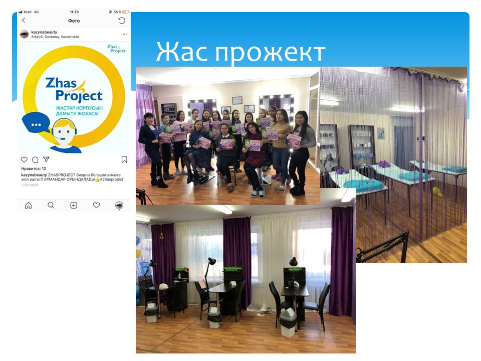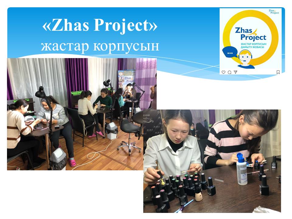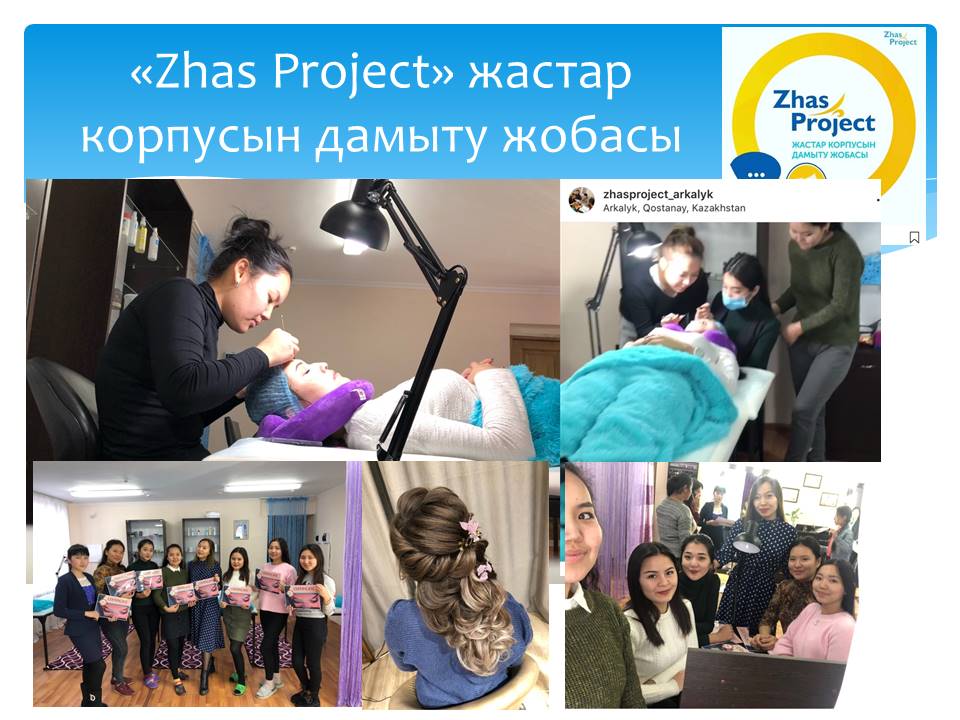 17 слайд Сондай ақ, биылғы жылы Республикамыздың 6 обылысын қамтыған Жастар корпусын дамытуға арналған «Жаспрожект» жобасына колледж атынан 4 жоба ұсынылып, 1 жеңімпаз атанды. Нәтижесінде қамқоршысыз, тұрмысы төмен, аз қамтылған отбасы балаларынан жасақталған 36 балаға сұлулық салоны шеберлері машығына тегін оқытылып жатыр.